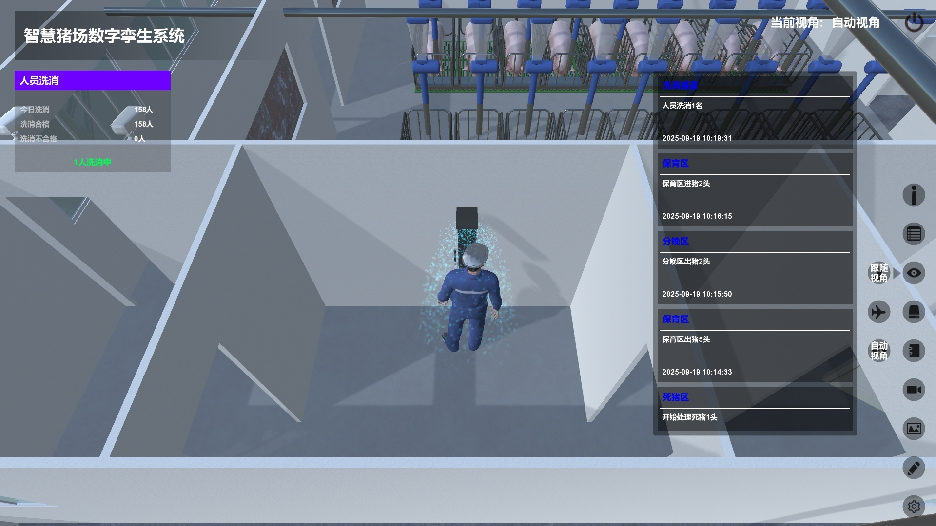 中控系統包含對人員消洗、人員巡舍、母豬轉舍、小豬轉舍、死豬流程、賣豬流程三維動畫演示及對配懷區、分娩區、保育區處設備(風機、水簾、溫度……)管控。